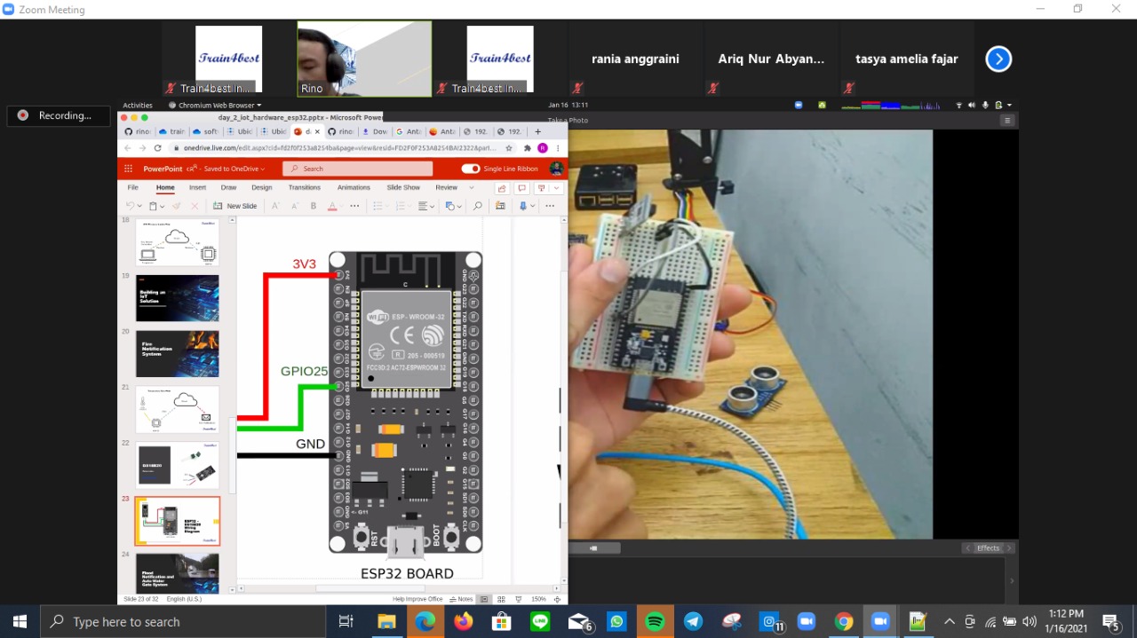 Kegiatan pelatihan IoT Day 2 dengan Sesi IoT Hardware dan Practical Hands On secara daring melalui platform Zoom Meeting dengan Sinta Novanana, S.T., M.Si. dan Rino Dwi Cahyono sebagai instruktur.