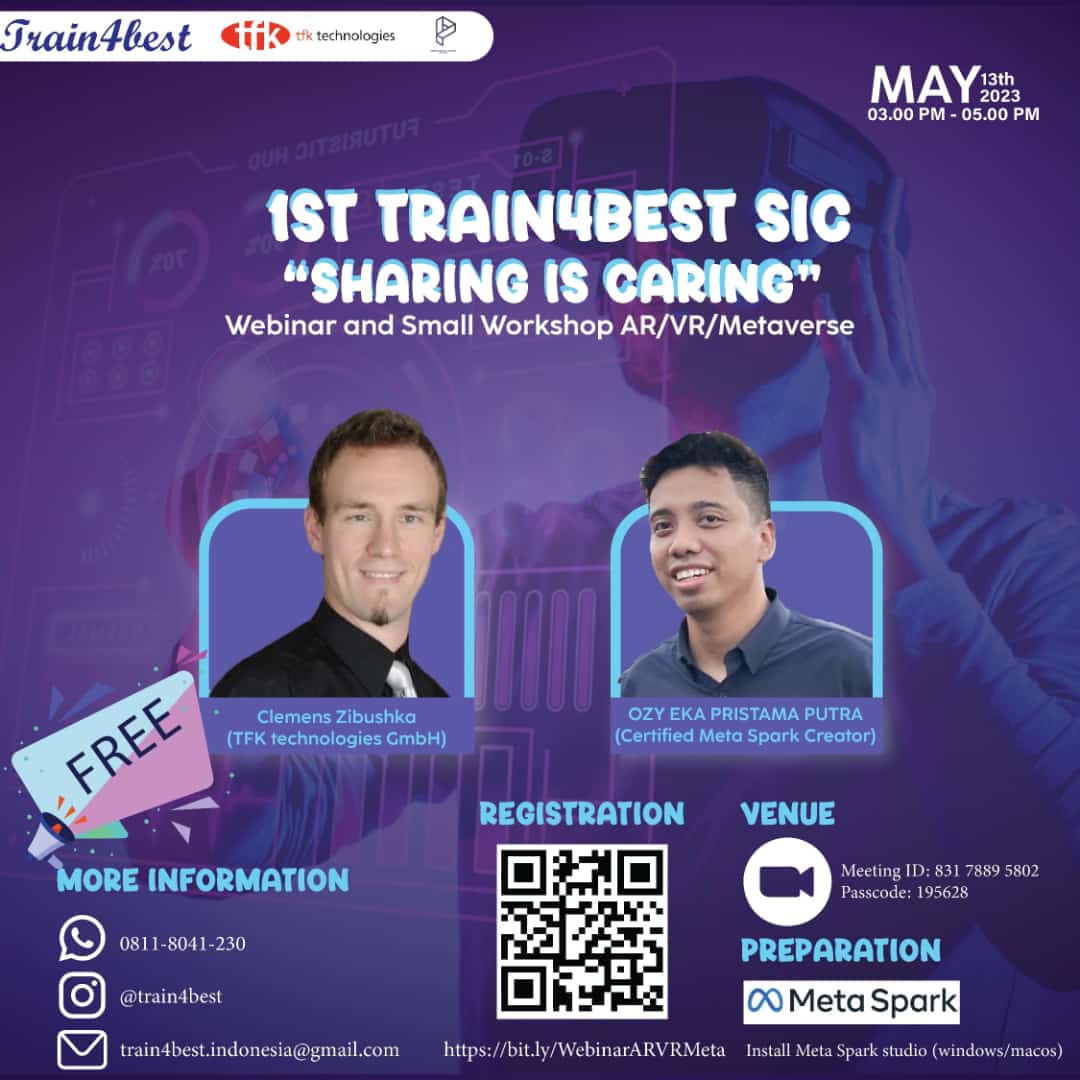AR/VR/Metaverse Webinar and Workshop had been held on May 13rd, 2023 with the concept "Sharing is Caring". Metaverse is a virtual world and being developed curently. it is a simulated digital infrastructure that employs Augmented Reality (AR). In this webinar a mini hands-on online workshop on how to build AR using Meta Spark Studio will be delivered. This webinar aims to produce various solutions and innovative thoughts related to issues and problems that become themes. It takes an active role from various parties in order to contribute to the state and nation of Indonesia. This webinar is a collaboration of the TFK technologies GmbH, Meta, and Train4best.