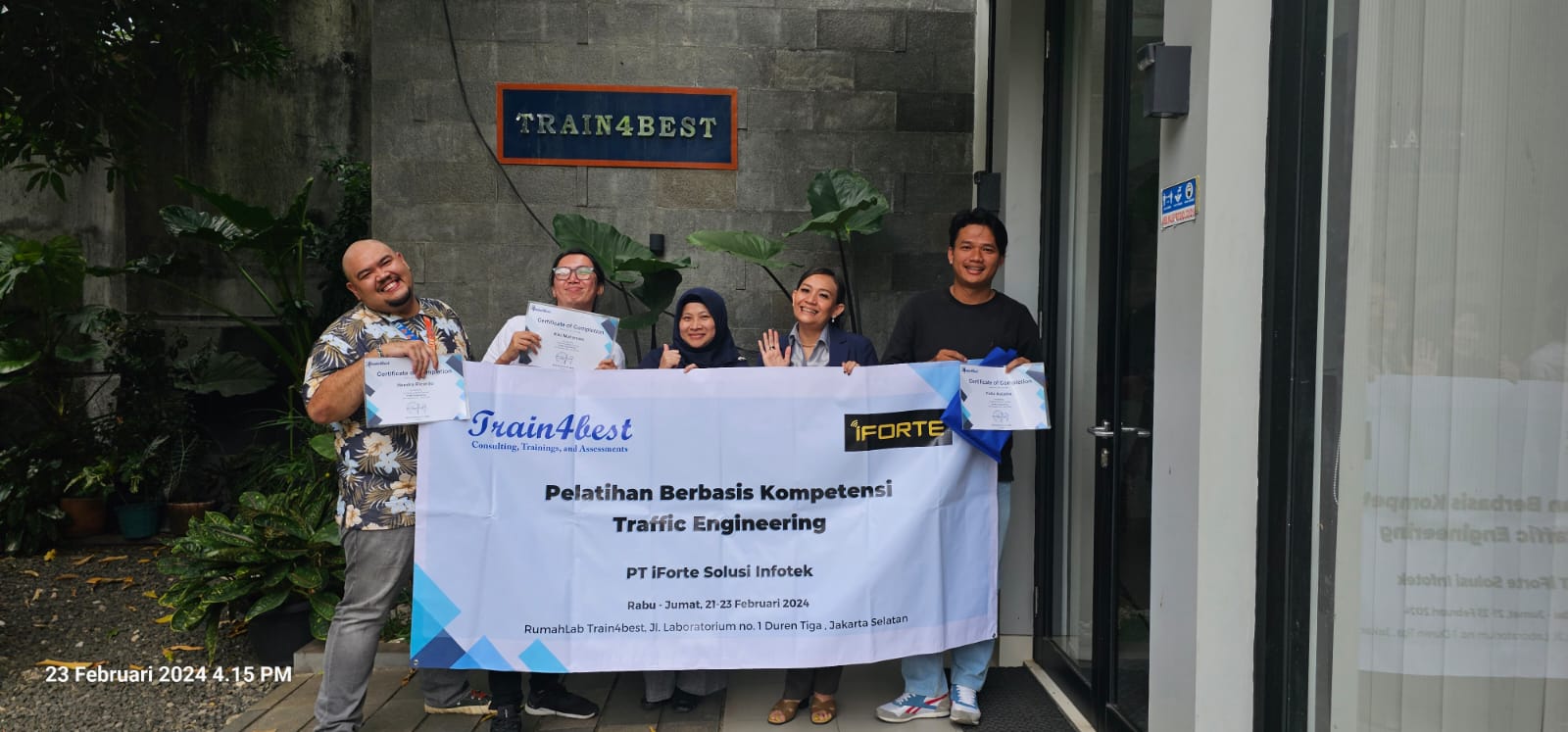 Pada hari Rabu sampai dengan Jum'at tanggal 21 sampai dengan 23 Februari 2024 bertempat di RumahLab Train4best Jln. Laboraturium no. 1 Duren Tiga Jakarta Selatan telah dilakukan Pelatihan Berbasis Kompetensi Traffic Engineering yang diikuti oleh 3 orang peserta dari PT. iForte Solusi Infotek. Hasil Pelatihan ini peserta mampu melakukan proses perhitungan dasar dan berbagai parameter lainnya didalam menentukan cakupan dan kapasitas yang dibutuhkan dari bagian infratstruktur sistem layanan komunikasi selular. Peserta juga mampu melakukan pemodelan, peramalan, dan dimensioning pada Traffic Telekomunikasi, melakukan praktik Analisa Jam Sibuk dan melihat Potensi Traffic berdasarkan data lapangan, serta memastikan dan memelihara kompetensi peserta agar sesuai dengan acuan SKKNI untuk Sertifikasi Kompetensi Traffic Engineering.