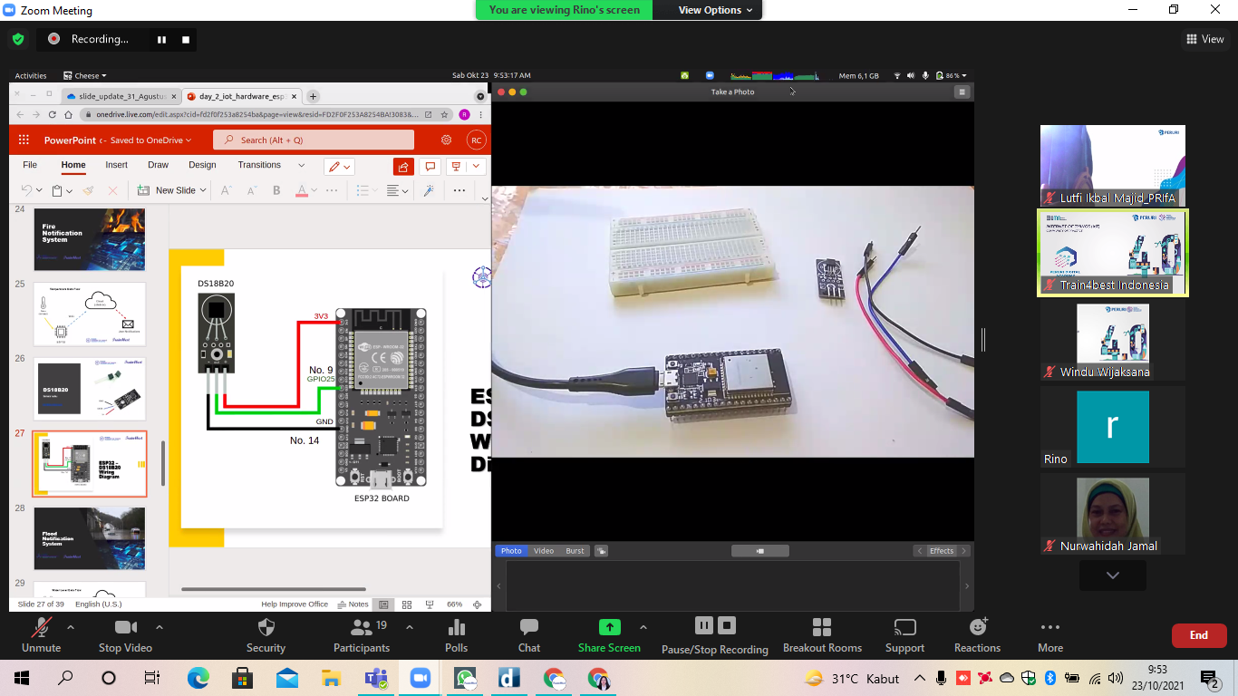 Kegiatan pelatihan IoT Day 3 dengan Sesi IoT Hardware dan Practical Hands On secara daring melalui platform Zoom Meeting dengan Rino Dwi Cahyono sebagai instruktur.