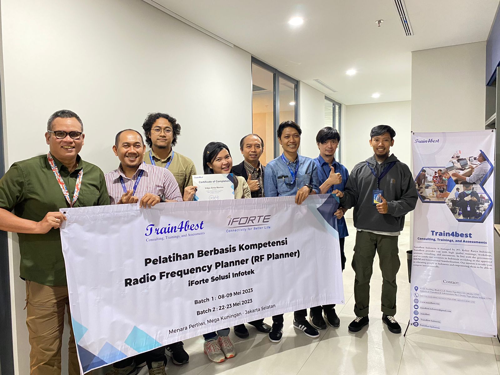 Pelatihan Radio Frequency Planner (RF Planner) Batch 1 yang diikuti oleh 7 peserta dari PT. iForte Solusi Infotek pada 08-09 Mei 2023 di Menara Pertiwi-Kawasan Mega Kuningan, Jl. Mega Kuningan Barat III, No.4 RW.5, Kuningan, Jakarta Selatan berfokus pada Desain Link Budget di Jaringan Akses, Perencanaan Coverage di Jaringan Akses, Perencanaan Radio Frekuensi di Jaringan Akses, serta praktik Radio Frekuensi. Pelatihan dibawakan oleh instruktur pelatihan yang expert di bidangnya. Hasil pelatihan peserta dapat mengetahui konsep dari Radio Frekuensi serta dapat praktik langsung mengenai Perencnaan Radio Frekuensi.